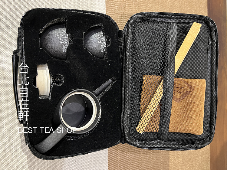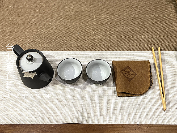 A pot, two cups, a towel, a bamboo clip and a storage bag